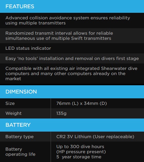 The Swift allows divers to carry multiple transmitters reliably. The collision avoidance protocol allows for multiple transmitters to be used at the same time with a lower likelihood of dropped communications. The Swift is designed and built in Canada for demanding divers of all proficiency levels.